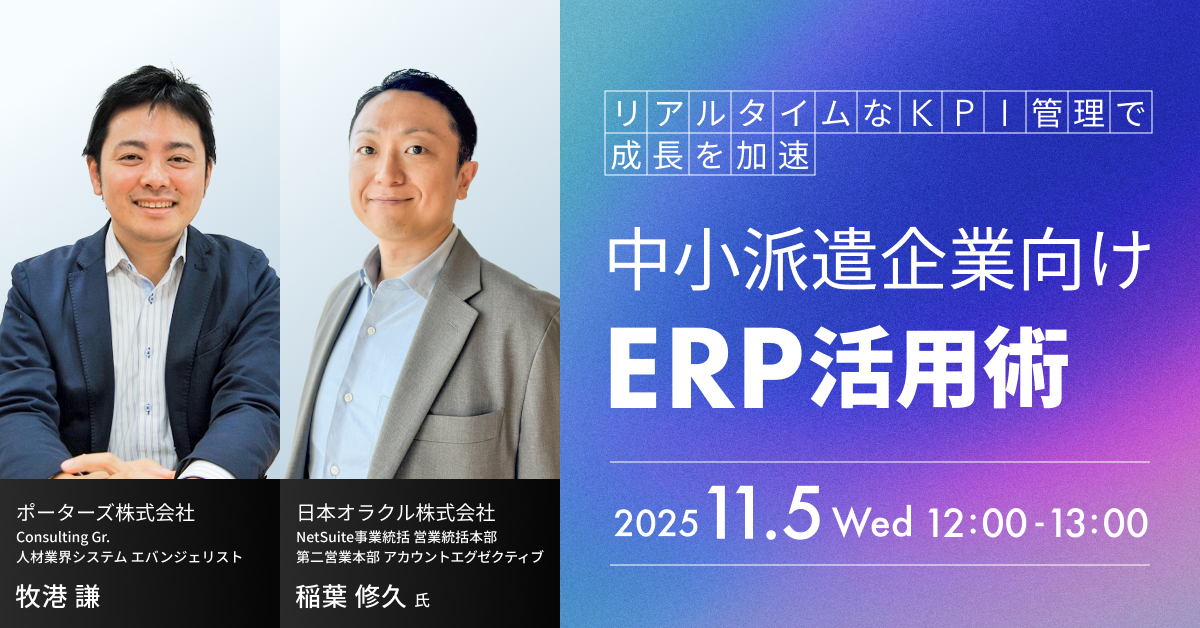本セミナーでは、「派遣企業の事業拡大の壁を乗り越えるデータ活用術」をテーマに、成長企業向けクラウドERP「Oracle NetSuite」を提供するオラクルと、人材派遣管理システム「PORTERS Staffing」を提供するポーターズが、会社の利益を軸とした業務改善のポイントを解説。