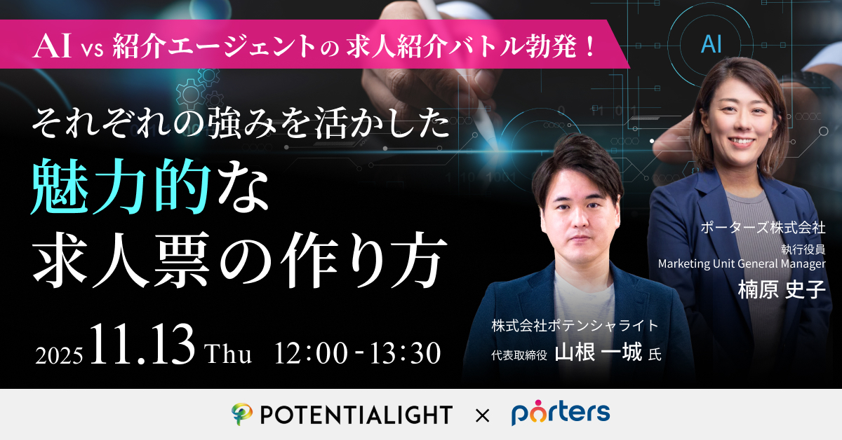 セミナー名 | 【ポーターズ×ポテンシャライト共催】 AI vs 紹介エージェントの求人紹介バトル勃発!それぞれの強みを活かした魅力的な求人票の作り方 |