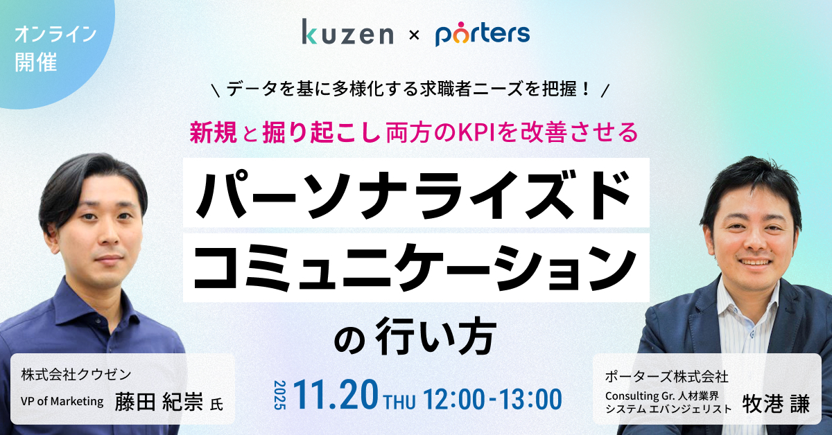 | セミナー名 | 【ポーターズ×クウゼン共催】 デ-タを基に多様化する求職者ニーズを把握! 新規と掘り起こし両方のKPIを改善させる「パーソナライズドコミュニケーション」の行い方 |