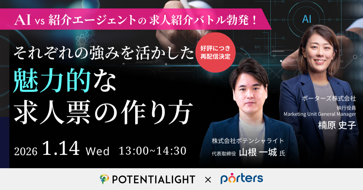 | セミナー名 | 【ポーターズ×ポテンシャライト共催】 【再配信】AI vs 紹介エージェントの求人紹介バトル勃発!それぞれの強みを活かした魅力的な求人票の作り方 |