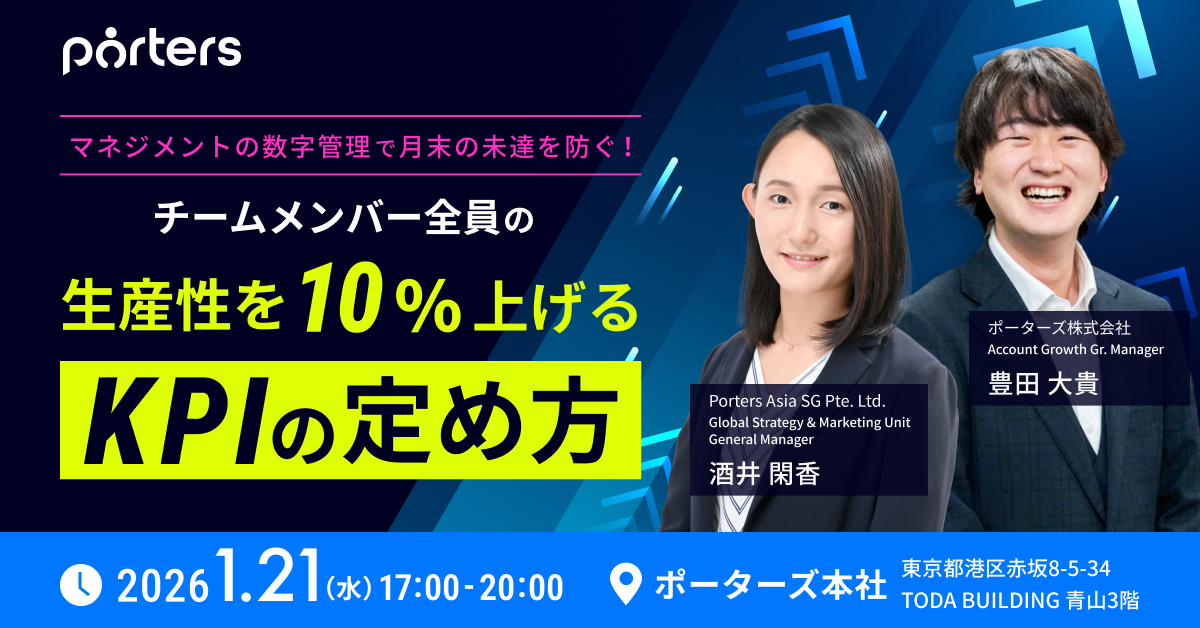 本セミナーでは、元ドーモジャパンのマーケティングマネージャーで、現在ポーターズ アジアでマーケティング部門のGeneral Managerを務める酒井閑香が、KPIマネジメントの進め方を解説。チームの生産性を10%上げるKPIの定め方から見る頻度、メンバーにKPIを意識させる方法まで、順を追って説明します。
