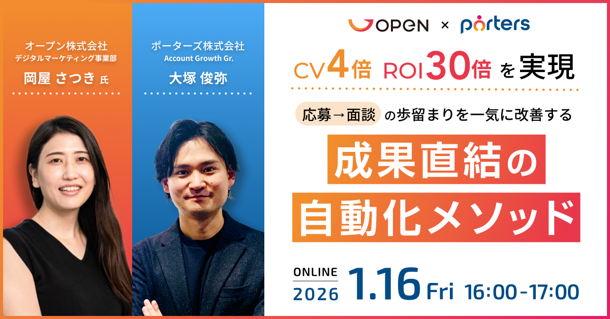 | セミナー名 | 【ポーターズ×オープン共催】 CV4倍・ROI30倍を実現 応募→面談の歩留まりを一気に改善する、成果直結の自動化メソッド |