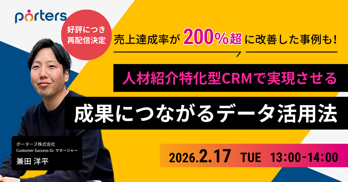 今回は、これまで大手人材紹介会社でRA・CAや拠点の立ち上げ責任者などの経験をしてきたポーターズ カスタマーサクセスグループ マネージャーの兼田 洋平が登壇。目標比200%超の売上増加に成功した企業の事例なども交えながら、自社事業の売上を最大化させるための、紹介特化CRM「PORTERS Agent」の活用方法を解説していきます。